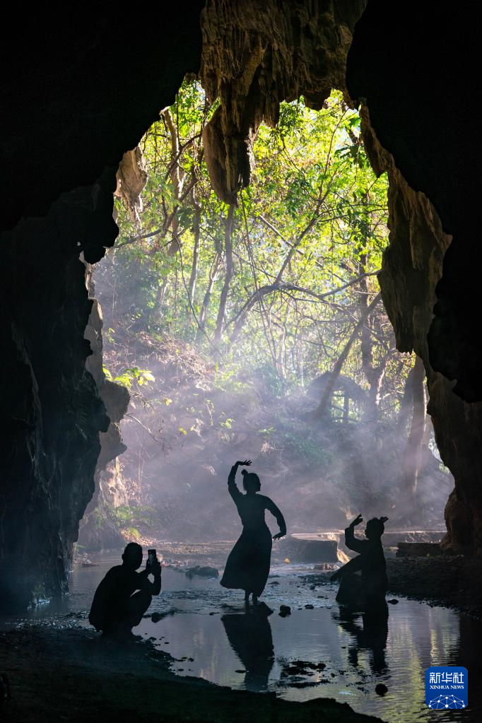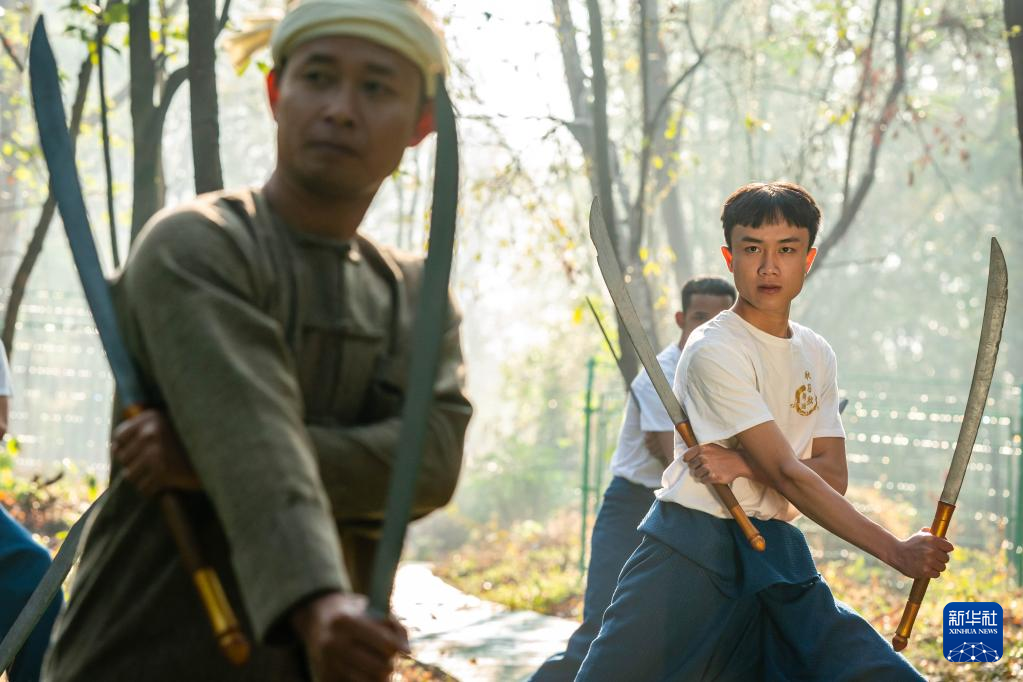 耿马县民族歌舞团团长王峰(左)在拍摄傣族女创拳小视频(3月23日摄)。新华社 记者胡超 摄