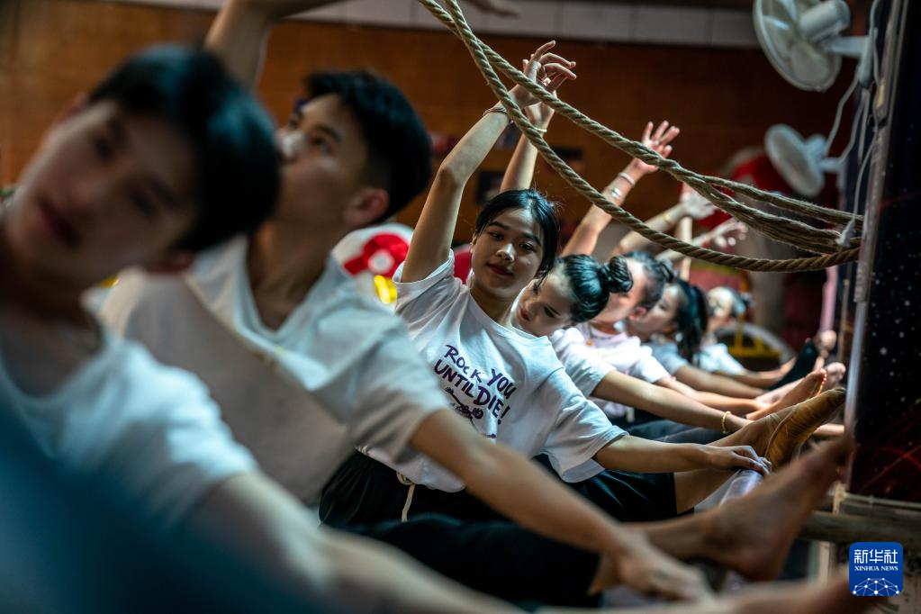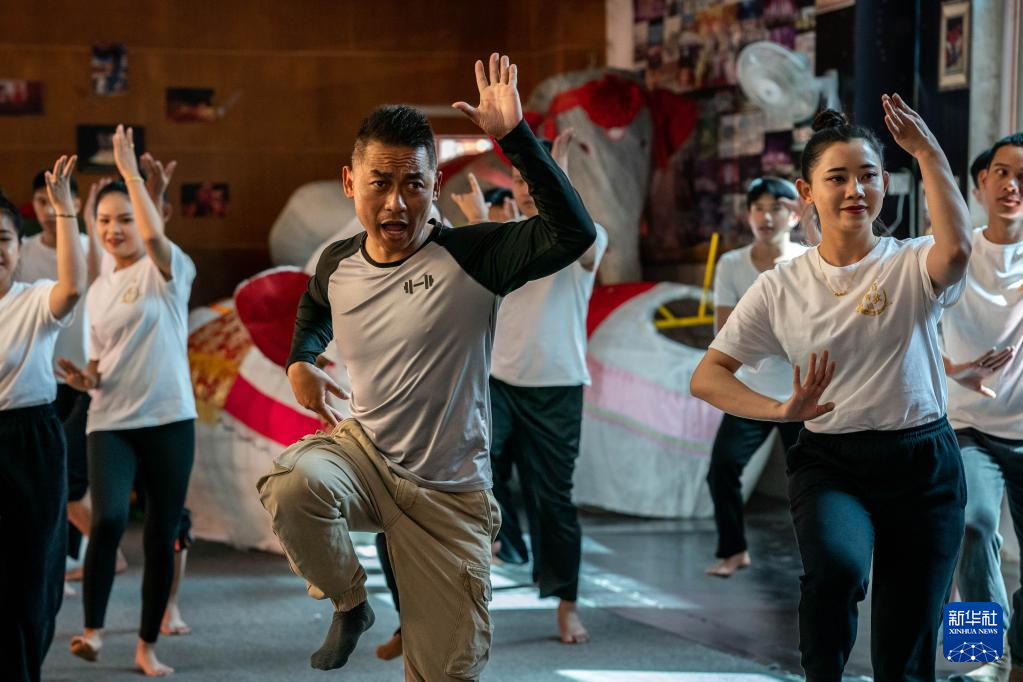 耿马县民族歌舞团团长王峰(前左)在练功房和演员们一起练习耿马傣族古乐舞(3月23日摄)。新华社 记者胡超 摄