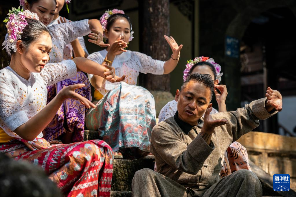 耿马县民族歌舞团团长王峰(右下)在和演员们交流舞蹈动作(3月23日摄)。新华社 记者胡超 摄