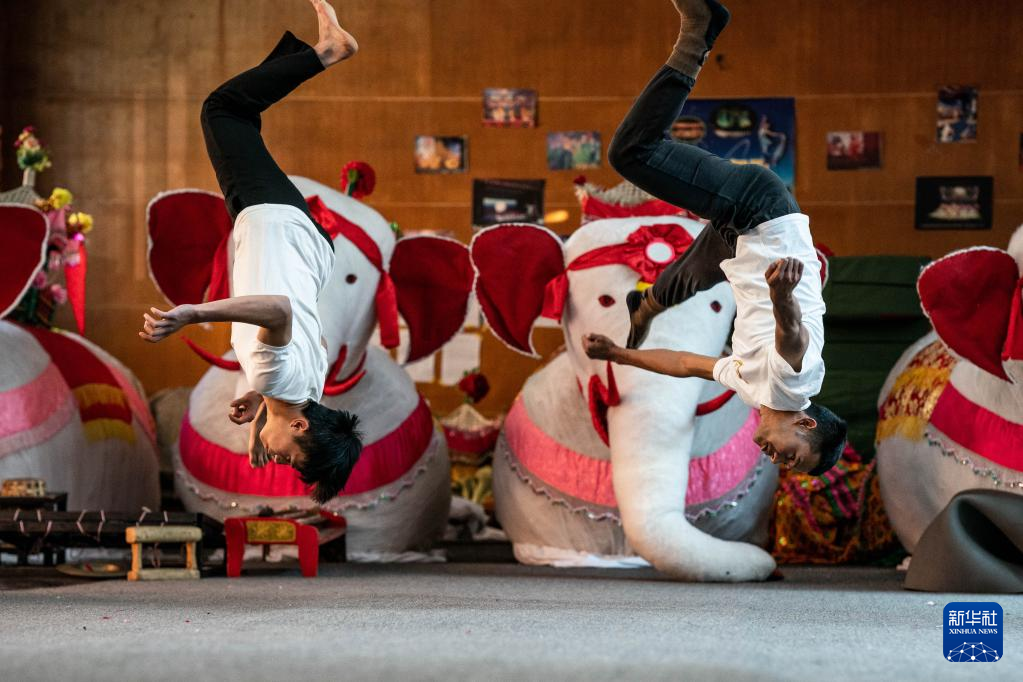 耿马县民族歌舞团演员岩平(左)、宰努思在练功房练习侧空翻(3月23日摄)。新华社 记者胡超 摄
