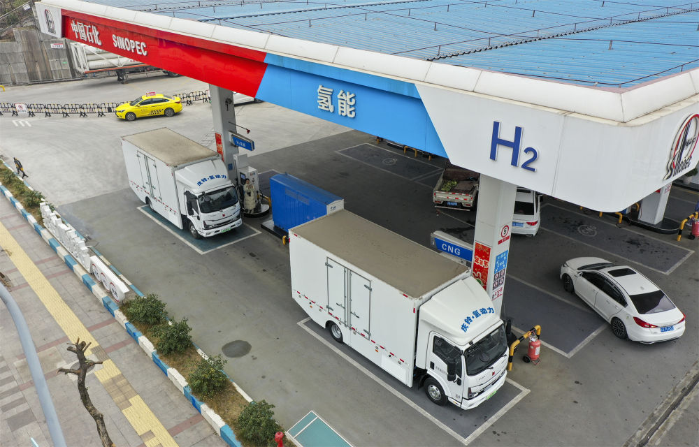 2023年2月8日,在位于九龙坡区的重庆首座加氢站内,两辆氢动力商用车在补充动力(无人机照片)。新华社记者 刘潺 摄