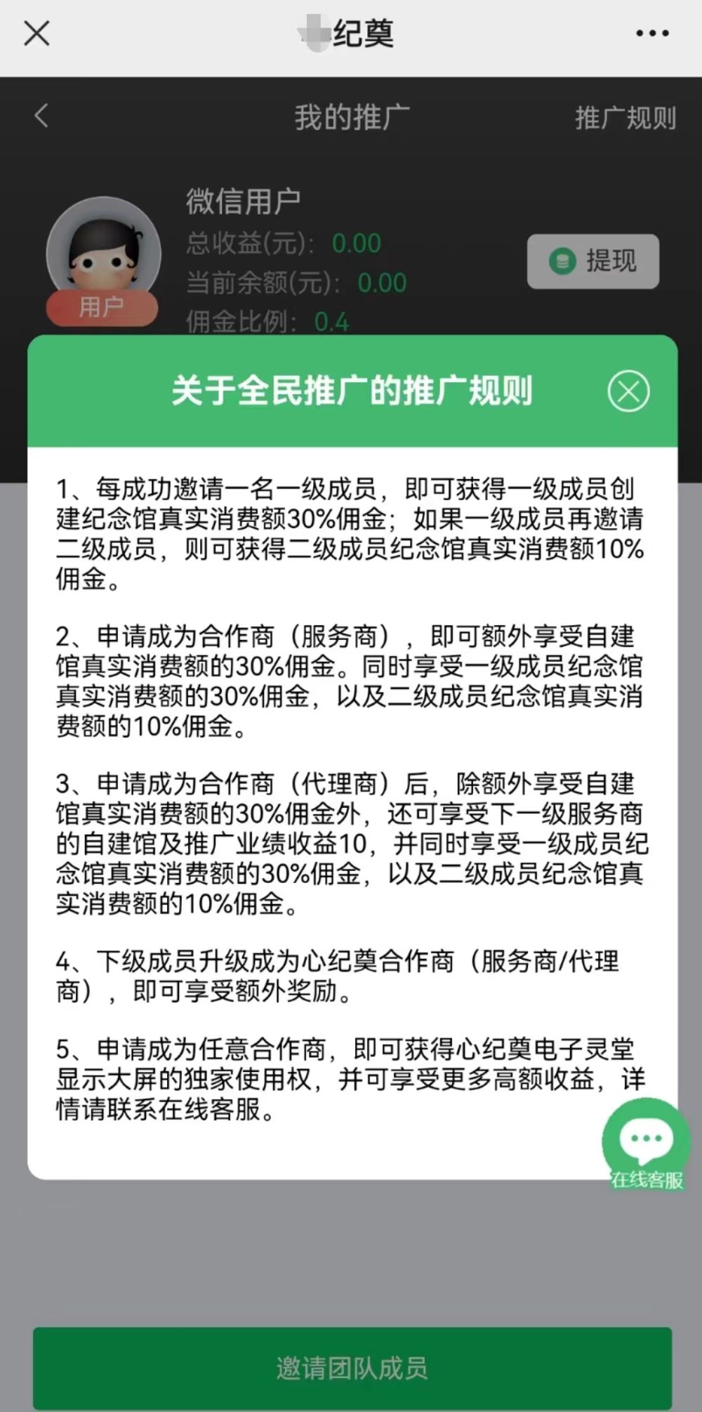 记者还发现,“心纪奠”平台通过消费抽成鼓励发展“下线”牟利。平台设计了复杂的“供品和套餐”,明确规定“每成功邀请一名一级成员,即可获得一级成员创建纪念馆真实消费额30%佣金;如果一级成员再邀请二级成员,则可获得二级成员纪念馆真实消费额10%佣金。”此外,成为“合作商”还可以享受额外的消费佣金。