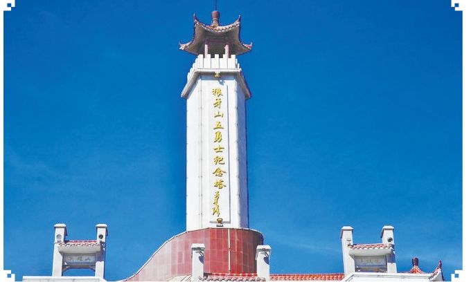 在河北易县境内的太行山巍巍群峰之中,有一座历史名山。因其酷似狼牙,直刺青天,故名“狼牙山”。1941年9月25日,在与日寇的激战中,为了掩护当地干部群众及主力部队的转移,五位八路军战士在班长马宝玉带领下,毅然将敌人引至三面峭壁悬崖的棋盘陀上。面对步步逼近、成群结队的敌军,他们宁死不屈,义无反顾地从狼牙山巅纵身跳崖。马宝玉、胡德林、胡福才壮烈牺牲,葛振林、宋学义在坠落过程中,因被岩石中长出的树木挂住,虽身负重伤但幸免于难。狼牙山五勇士纪念塔底座3.06米,塔身五层,呈正五边形。塔身呈乳白色,高21.5米;塔身上部镶嵌着“狼牙山五勇士纪念塔”九个金光闪闪的大字;塔身下部呈军旗形,镶嵌着汉白玉的五勇士半身浮雕像,浮雕下镌刻有碑文。
