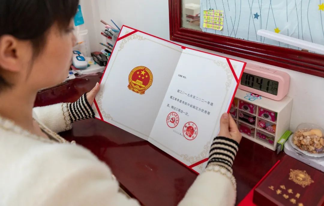 张兰在派出所荣誉室擦拭孔锦荣与战友的合影照
