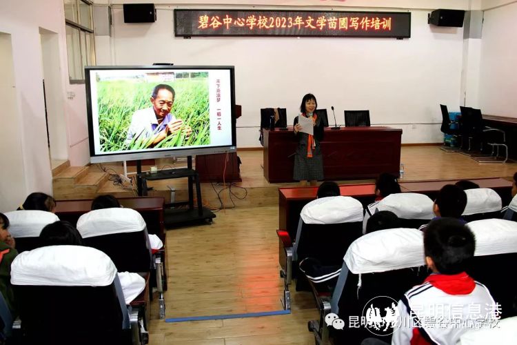 在东川区碧谷中心学校,昆明儿童文学作家楼琳由“禾下乘凉梦,一稻一人生”的袁隆平事迹导入,声情并茂地介绍了袁隆平、钟南山、邱家栋等典型人物事迹,以此展开讲述人物描写的五种方法、人物形象的三大特征,由此及彼层层推进,对人物描写的习作教学作了详尽的讲解。整个过程气氛活跃、深入浅出,为老师和同学们打开了眼界、启发了思路。