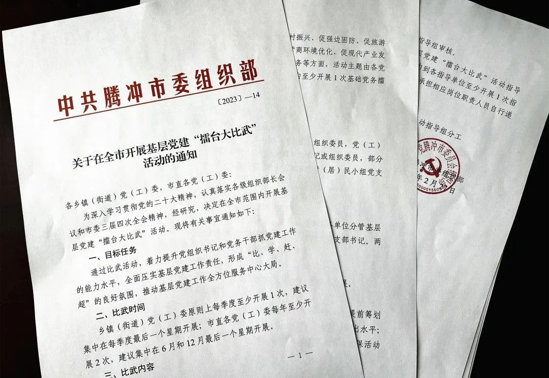 开年即决战,起步即冲刺。年初,腾冲市委组织部印发《关于在全市开展基层党建“擂台大比武”活动的通知》,明确要求乡镇(街道)党(工)委每季度至少开展1次、市直各党(工)委每年至少开展2次“擂台大比武”活动。“擂台比武”重点围绕抓党建促乡村振兴、促强边固防、促旅游高质量发展、促城乡基层治理、促营商环境优化、促现代产业发展,党组织领办农民合作社及基础党务等主题开展。市委组织部组建5个指导组前往“擂台比武”现场,结合日常工作调研情况进行现场指导和点评,帮助党组织书记和党务干部厘清工作思路、解答发展困惑。今年以来,19个乡镇(街道)党组织均完成了第一季度“擂台比武”活动。