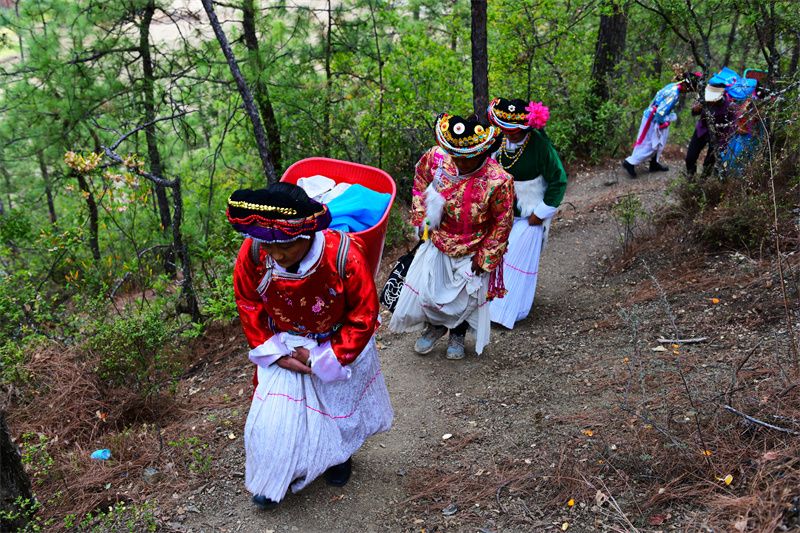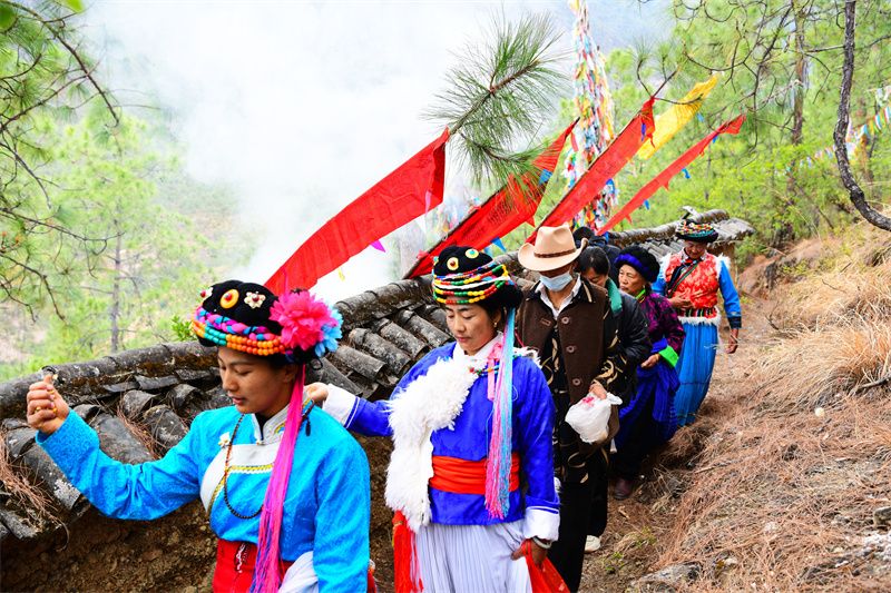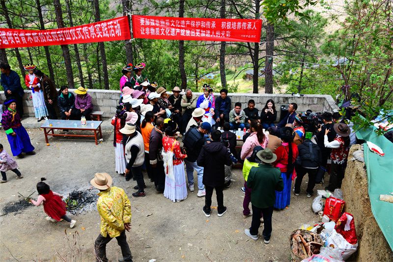 4月5日,在宁蒗县拉伯乡托甸村委会黑尔甸村,村民依照传统惯例在拈达神山举办普米族拈达则封山仪式传承实践活动。丽江市非物质文化遗产保护中心、宁蒗县非物质文化遗产保护中心的工作人员通过视频,对仪式流程进行了记录。