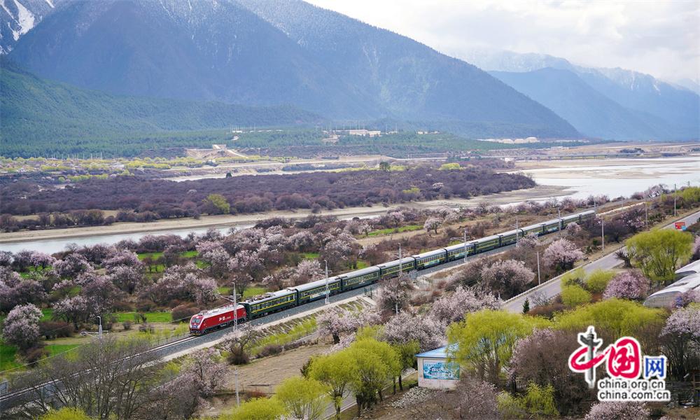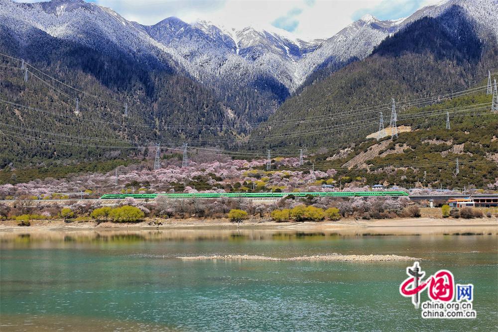每年3-4月份,拉林铁路沿线绵延百里的野生桃花林盛开,蓝天、白云、桃花、雪山、火车相互交织,形成了美不胜收的人间仙境。
