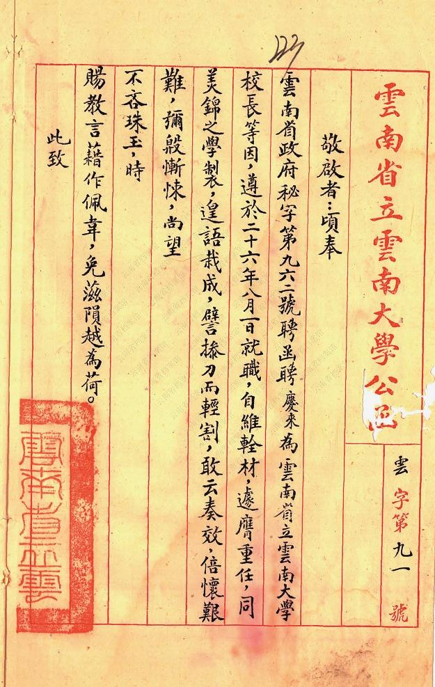 云南省立云南大学关于告知校长熊庆来就职日期的公函