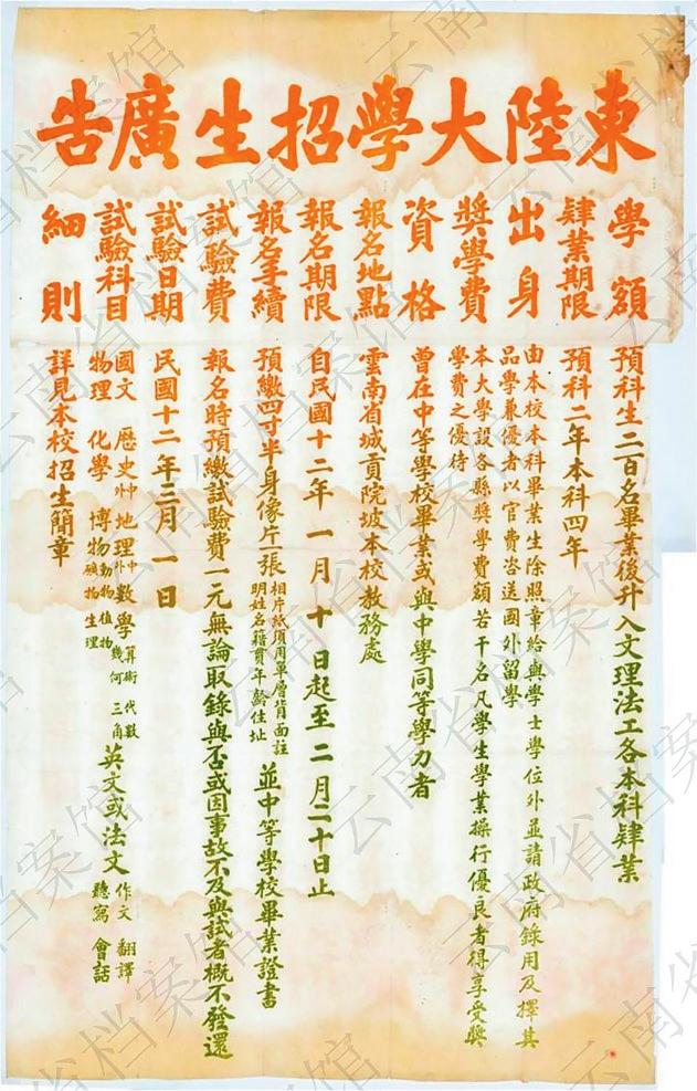 1922年11月《民治报》《义声报》等各大报纸同步发布了东陆大学的招生广告、招生简章。1923年3月14日,东陆大学布告预科入学考试时间及规则;22日,预科生入学考试。预科设定为二年,东陆大学第一期仅招预科生四班,每班50名共计200名,以后逐年添招,按级升入。1923年4月20日,东陆大学举行了隆重的新校舍奠基及开学典礼,前来参会的各级官员、友邦领事、学校、公团来宾约数千人。