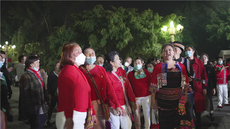 每当夜幕降临,云南省临沧市镇康县城南伞河畔公园广场上,忙碌了一天的人们都聚集在一起,用悠悠三弦声,伴随地方传统民间音乐“阿数瑟”,解乏一天的疲惫。