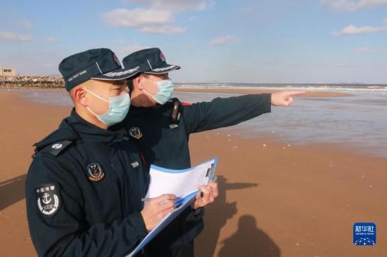山东烟台海警局执法员在烟台高新区附近海域开展陆岸巡查,检查有无未经许可违规占用海域情况(2023年1月16日摄)。新华社发(卢煜萱 摄)