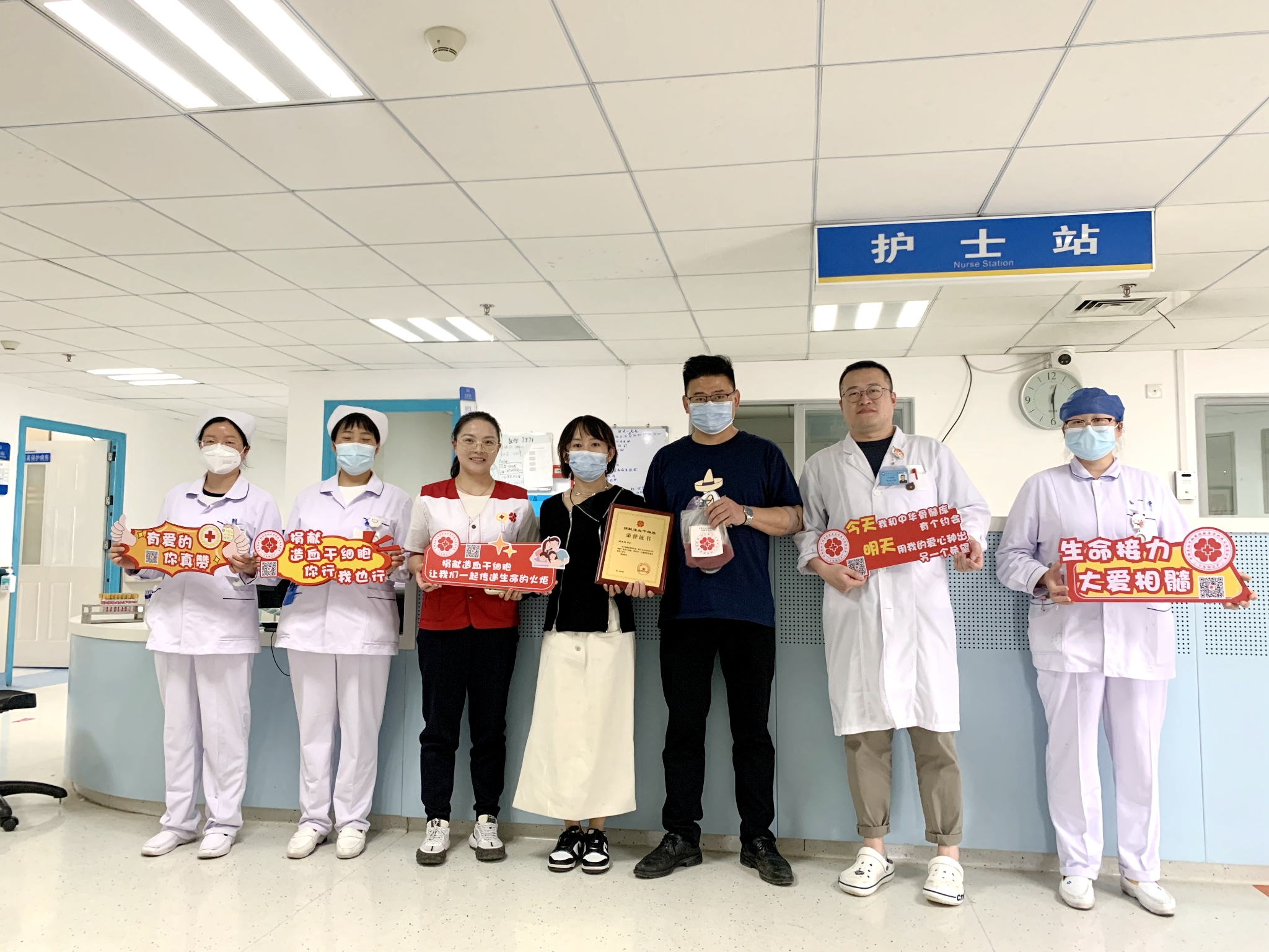 邱先生捐献结束后与妻子、省红十字会工作人员、医生合影留念。