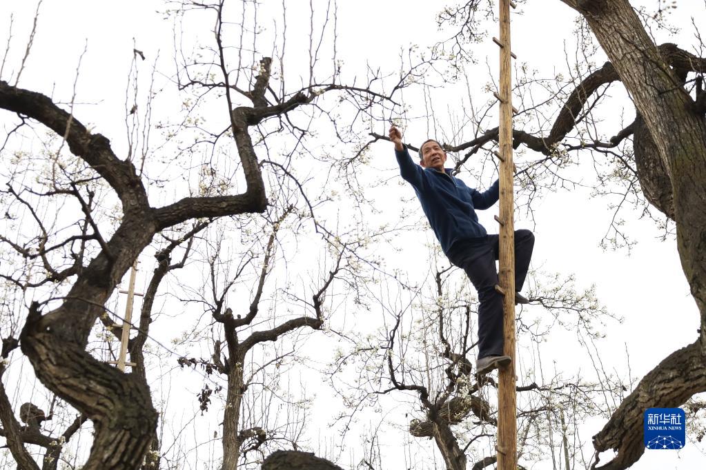 4月10日,兰州市皋兰县什川镇上车村村民在自家古梨园里为梨树疏花。新华社记者马希平/摄