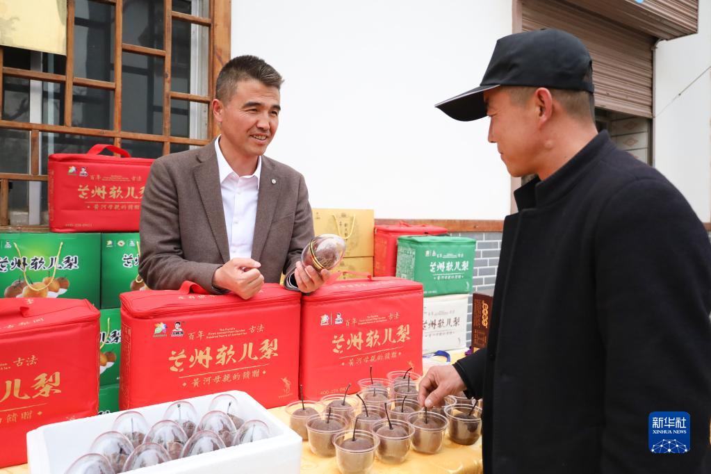 4月10日,在兰州市皋兰县什川古梨园里的商品街,商户为游客推介什川镇特色农产品软儿梨。新华社记者马希平/摄