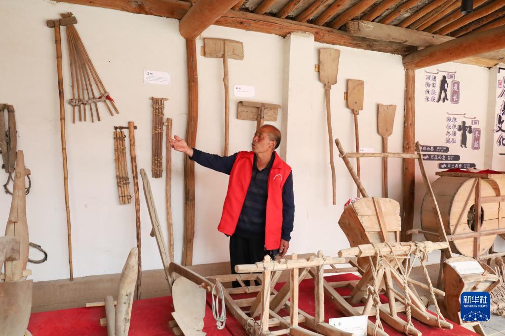 4月10日,兰州市皋兰县什川古梨园农耕文化展示馆工作人员为游客介绍传统农具。新华社记者马希平/摄