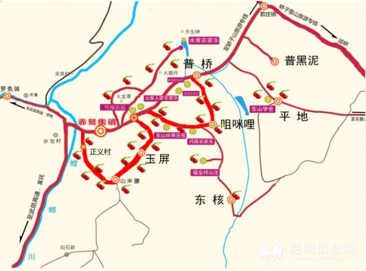 赤鹫镇位于昆明市西北部,距昆明主城42公里,大约40分钟车程。赤鹫樱桃在昆明名气不小,每年4月,赤鹫樱桃就进入昆明的菜市、果摊,成为市民喜爱的时令水果。