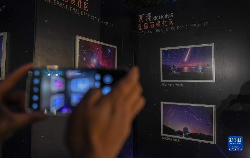 4月10日,参观者在“西涌国际暗夜社区”授牌仪式上拍摄展出的西涌星空图。新华社记者毛思倩/摄