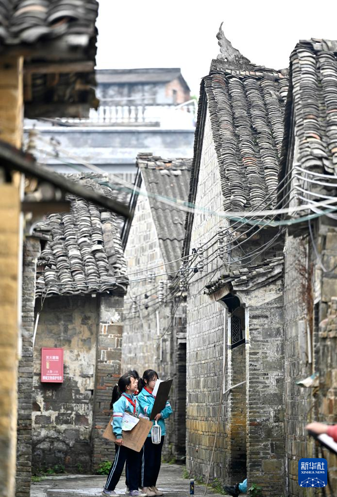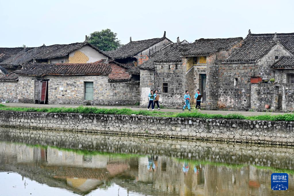 4月10日,在柳城县古砦仫佬族乡大户村滩头屯,几名学生跟随老师在民居旁写生。新华社发(黎寒池/摄)