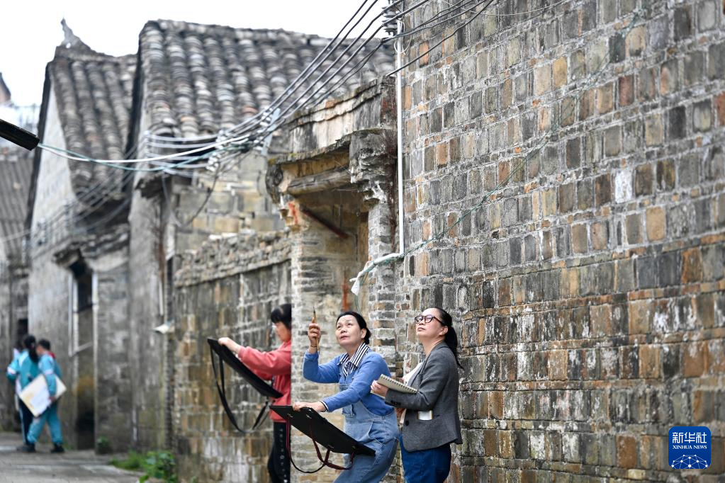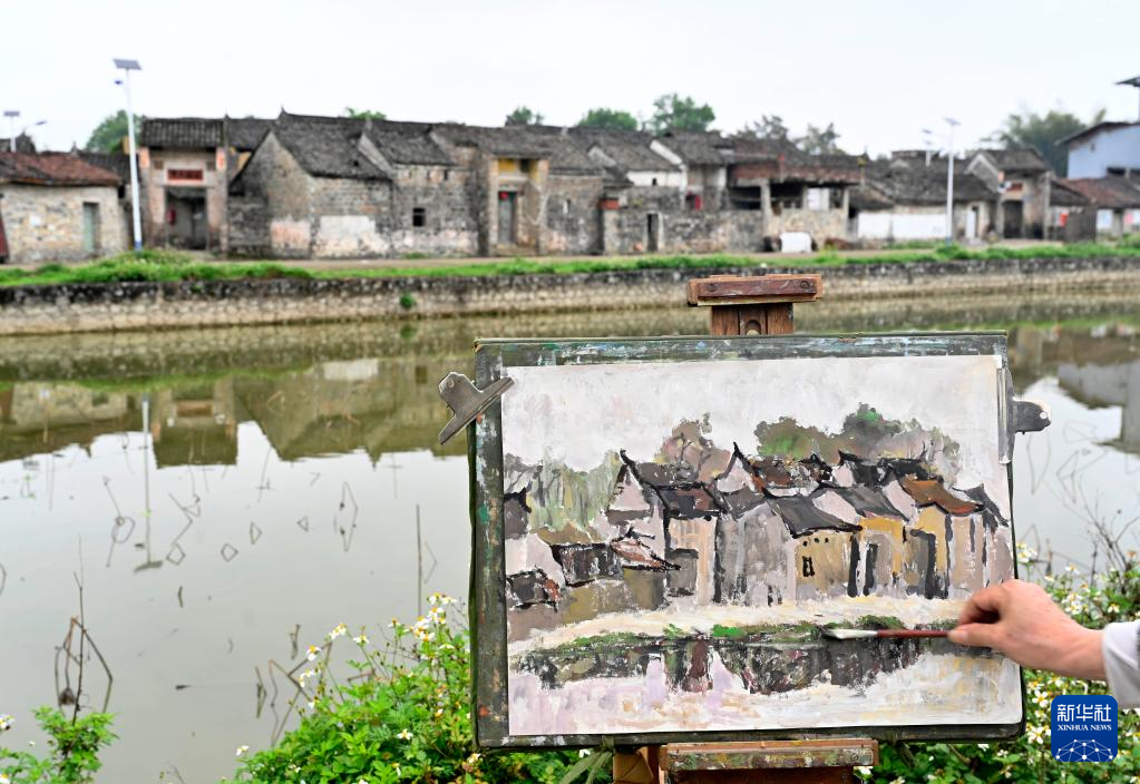 4月10日,在柳城县古砦仫佬族乡大户村滩头屯,绘画爱好者在民居旁写生。新华社发(黎寒池/摄)