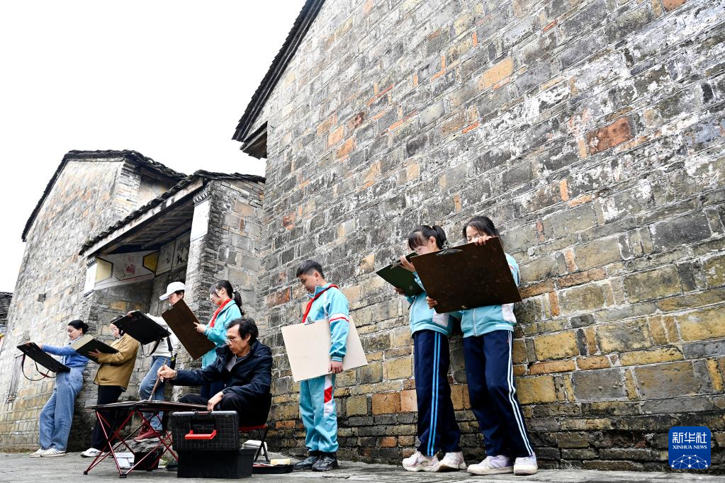 4月10日,学生在柳城县古砦仫佬族乡大户村滩头屯内写生。新华社发(黎寒池/摄)