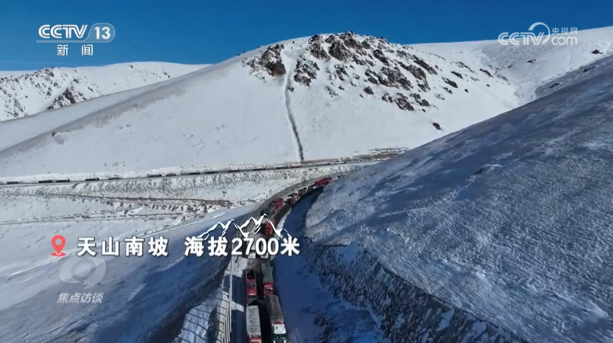 三月,天山上依然白雪茫茫,翻越天山的道路因冬季而封闭,想从南疆到北疆只能开上山至海拔三千多米后再绕行。然而,一天前的大雪,道路结冰,这些货车被滞留在了半山腰。