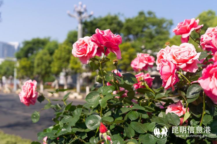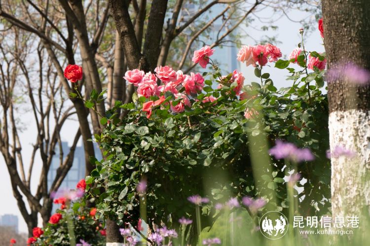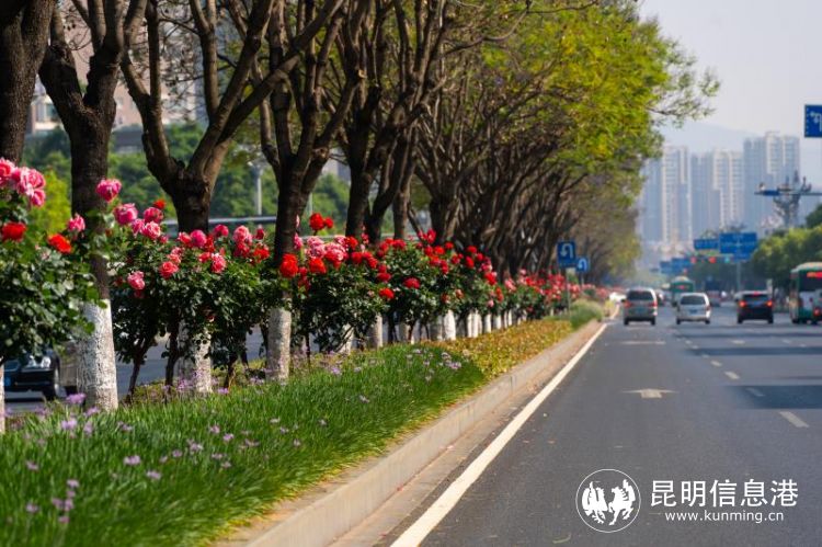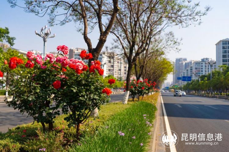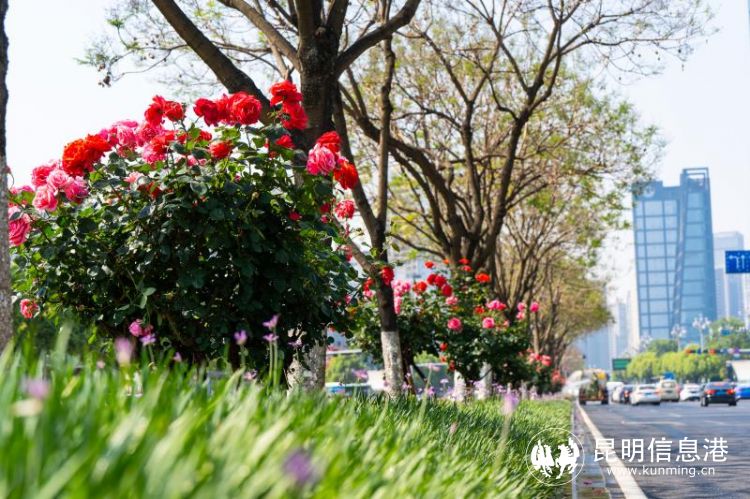 昆明市区主干道隔离带内树状月季的盛开,在合理处理交通与绿化关系的基础上,消除了人们的视觉疲劳,让整个城市空间充满了春的活力、城市生态更加宜居宜业。