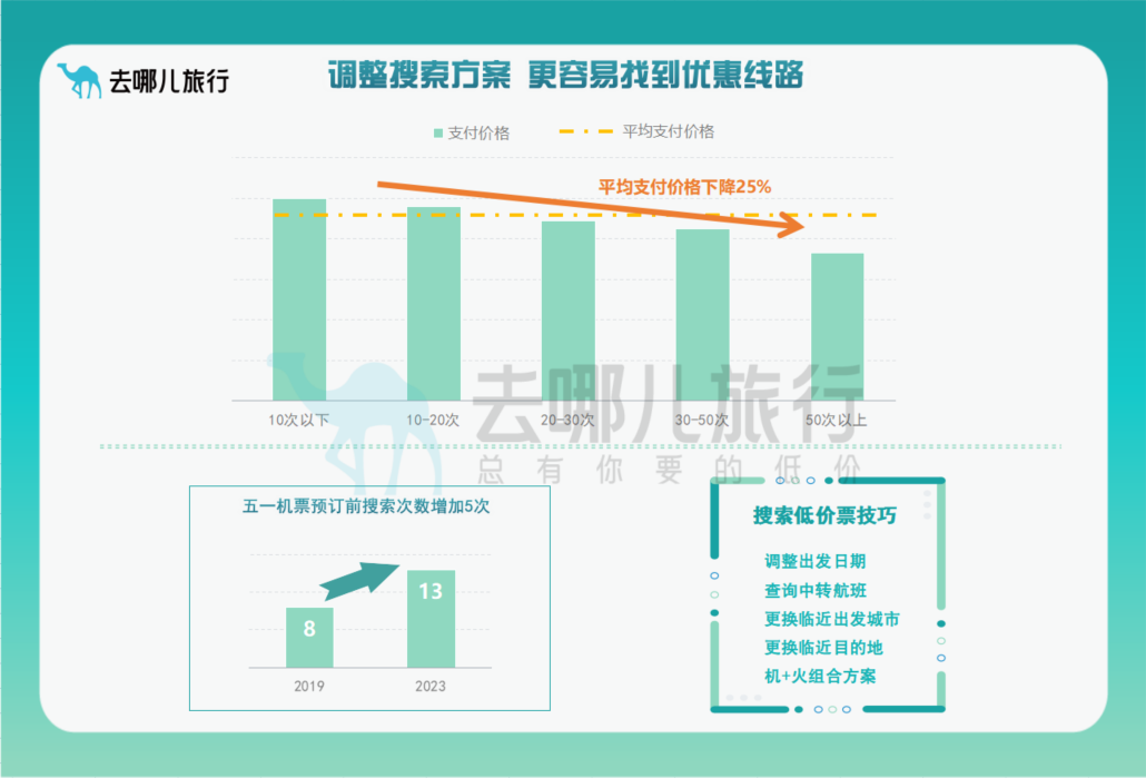 去哪儿数据统计,节假日前,用户预订前平均搜索量为13次,较2019年平均增加5次。通过调整搜索方案,更容易淘到低价票。搜索比价50次以上的用户比搜索10次以下的用户,淘到低价票的概率更高,平均支付价格低四分之一。