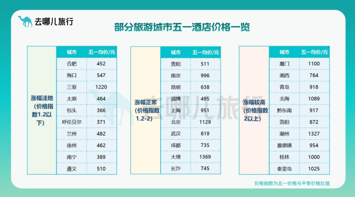 尽管五一预订火爆,依然存在一些可捡漏的目的地。据去哪儿统计,广东阳江、青海西宁、山西太原、甘肃兰州等目的地酒店预订尚未起量,广东东莞、贵州遵义、江苏徐州、广西南宁等地酒店价格并无明显增长。