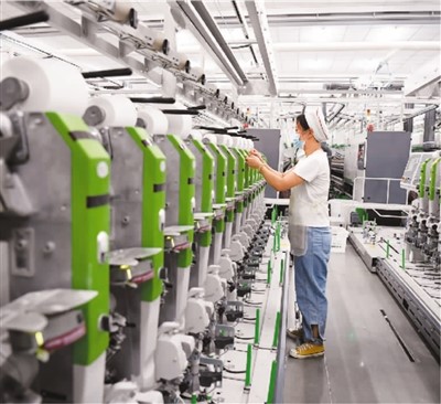 江西省宜春市奉新县积极引导纺织企业数字化转型升级,淘汰落后高能耗低效率生产设备,引进智能高效节能设备,助推纺织产业高质量发展。图为奉新县江西金源纺织有限公司的员工在全自动粗细络联生产线上紧张忙碌。周亮摄(人民图片)