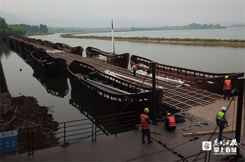 施工单位中建六局滇池绿道项目部负责人介绍,施工单位在浮桥实施过程中采取提前在工厂预拼装方案,按照顺序组织生产、运输和安装,从而减少现场焊接和切割等施工环节,加快施工进度。