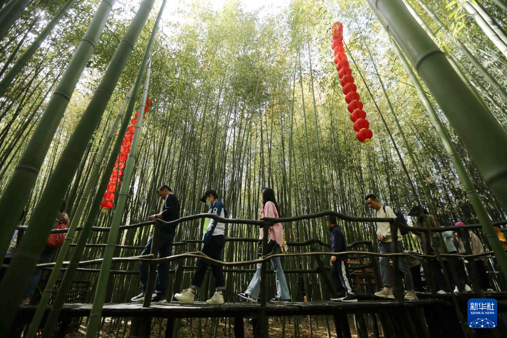 4月16日,游客在沂南县铜井镇竹泉村竹林中游玩。新华社发(王彦冰 摄)