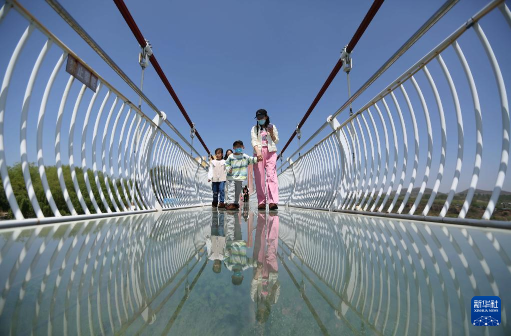4月16日,游客在沂南县红石寨景区体验高空玻璃吊桥。新华社发(王彦冰 摄)