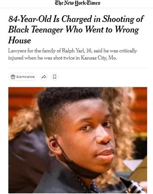 据《纽约时报》报道,16岁少年拉尔夫·保罗·亚尔的律师表示,13日晚10点左右,亚尔去朋友家接他弟弟时因弄错地址按错了门铃,一名白人男子开枪击中他的头部和手臂。