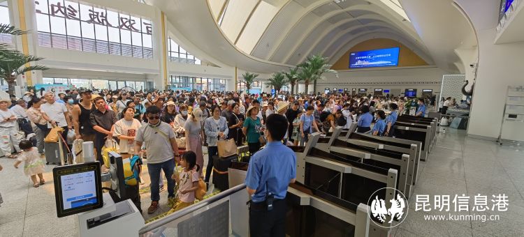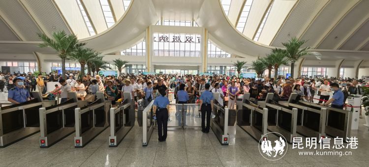 昆明信息港讯 记者上官艳君 4月19日,西双版纳站候车大厅内人潮涌动。拎着大包小包的旅客在闸机前排成长龙等待验证进站乘车,身着傣族服饰的工作人员在“丝路·金花”服务台前为旅客提供列车信息咨询、退改签等温馨服务。