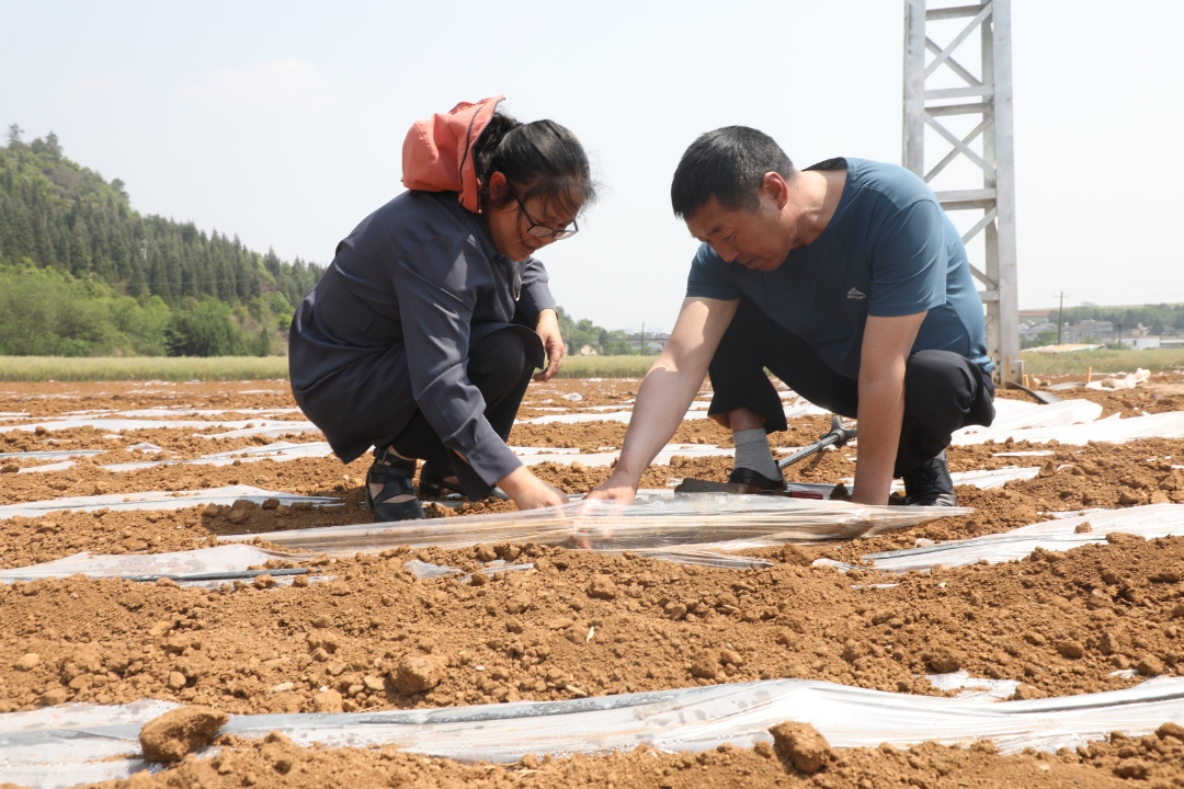 在张合生的姜地里,罗平县生姜技术推广站站长葛丽清与他交流小黄姜的发芽情况,以及采用水肥一体化覆膜种植技术带来的效果。张合生扒开地膜,从土里抠出一块姜种,只见嫩嫩的姜芽已长出半公分。