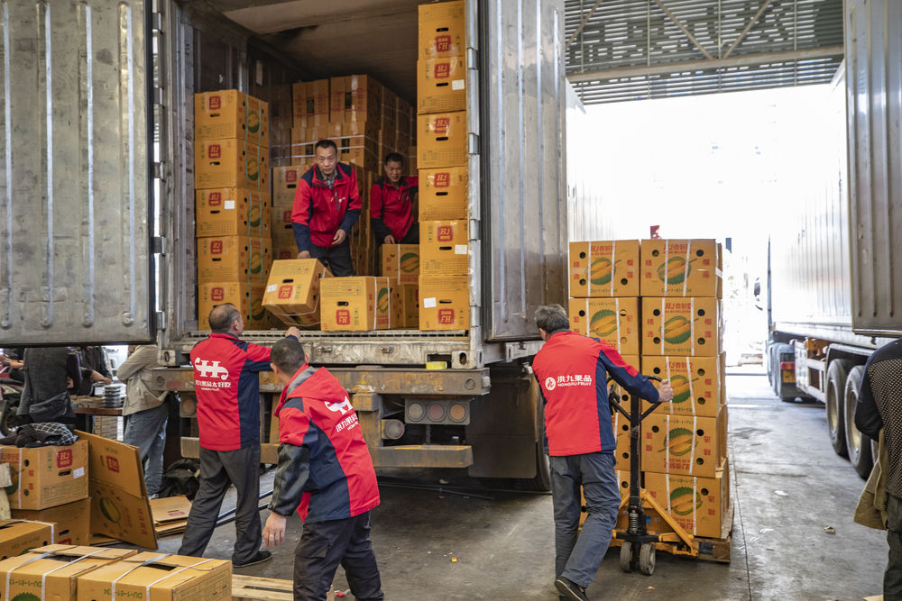 在重庆市江津区双福农贸城,洪九果品的工作人员在搬运从泰国运输过来的榴莲。新华社记者黄伟 摄