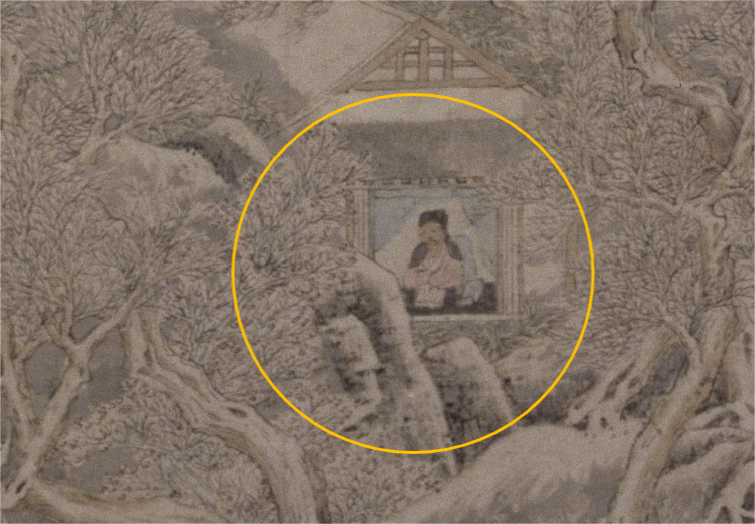 白云、瀑布、楼阁穿插于重峦叠嶂的林木间,一派气象万千的苍郁景致。有一人于山坞草堂内临窗读书。
