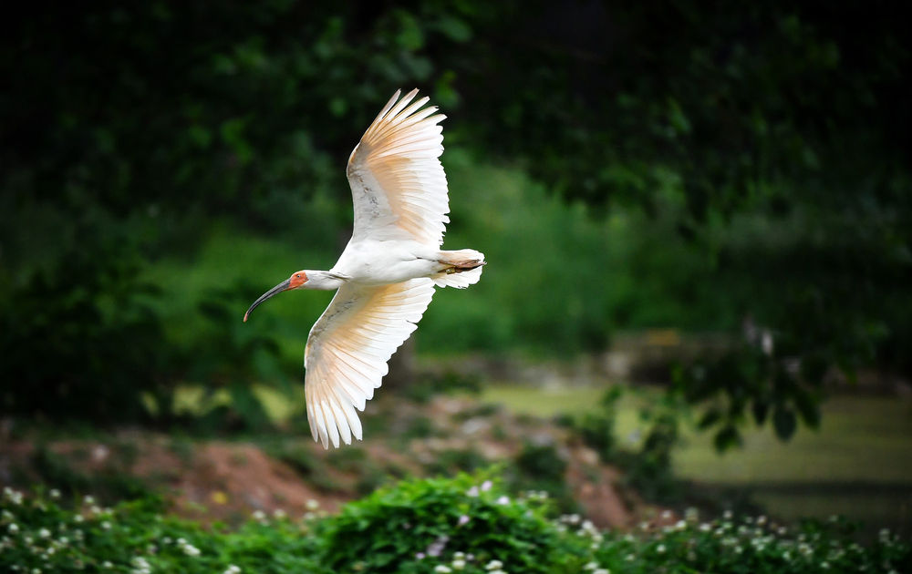 ↑这是陕西省汉中市洋县朱鹮生态园内的朱鹮(2021年5月13日摄)。