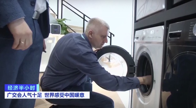 在一家韩国产品的展示区,在广交会首发的身体和足部干燥机只需要2分钟可以吹干全身,主要用于不方便自己擦干身体的失能的老人或者是孕妇。马来西亚的一个产品展示台上,一款电熨斗可以根据布料的厚薄自动调节熨烫温度。