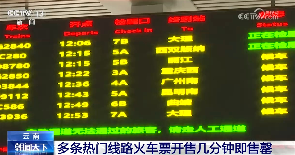 在云南昆明,随着“五一”假期临近,多条热门线路火车票开售仅几分钟就全部售罄,4月29日昆明南开往万象站的车票也全部售出。