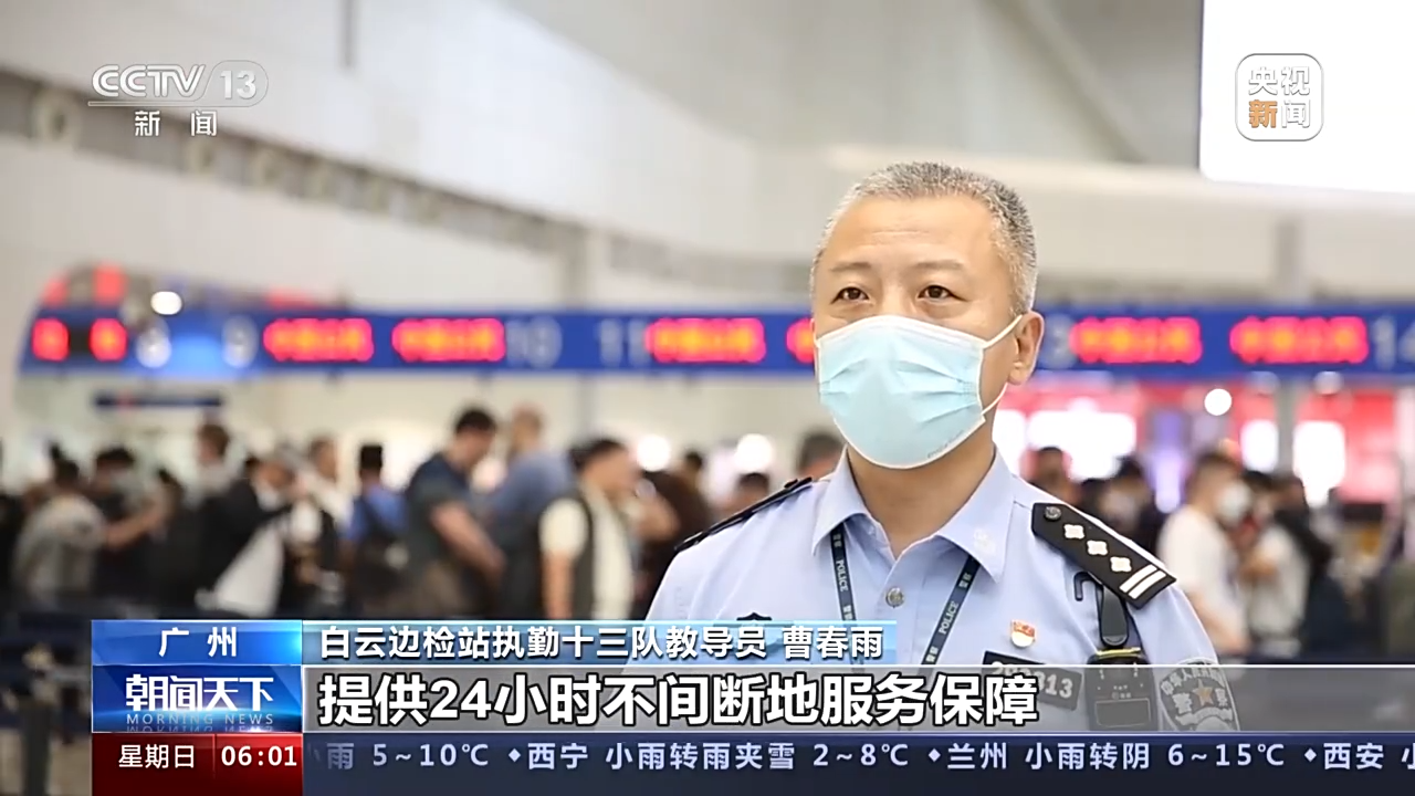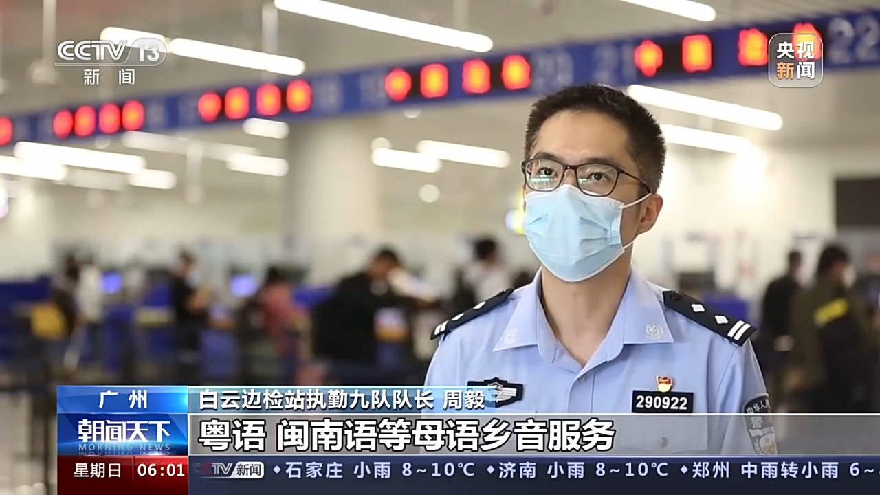 白云边检站执勤九队队长 周毅:除了英语以外,我们还积极为外国旅客提供包括法语、阿拉伯语、泰语、越南语等多种语言的面对面翻译和引导咨询服务。向有需要的归国华侨提供粤语、闽南语等母语乡音服务,确保沟通交流顺畅。