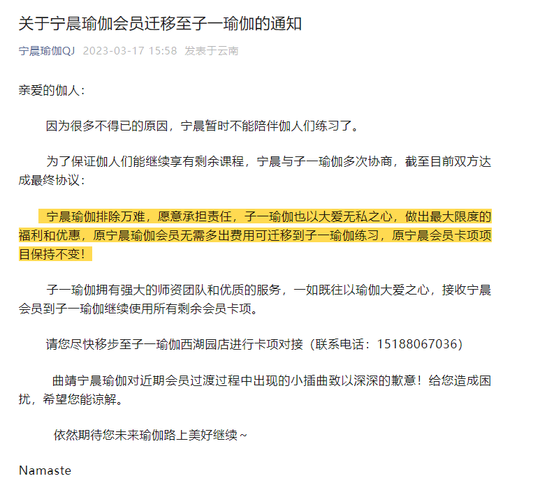 记者查询到,宁晨瑜伽曲靖店早在3月7日已发布公告,原宁晨瑜伽会员无需多出费用可迁移到子一瑜伽练习,原宁晨会员卡项项目保持不变!