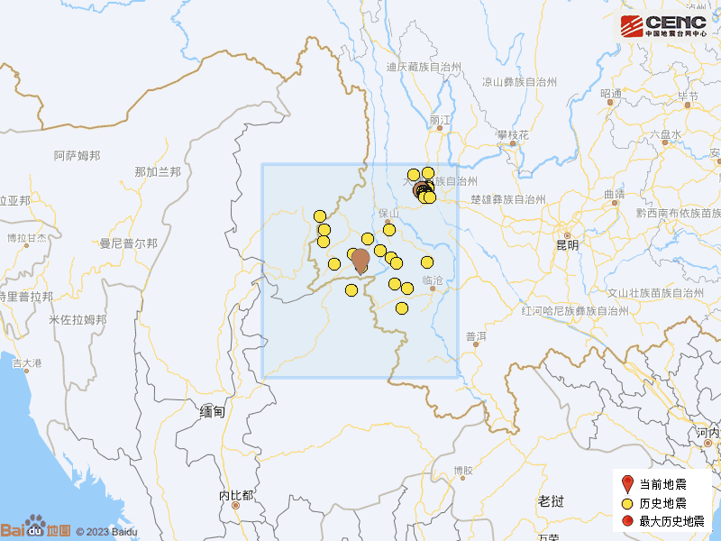 历史地震:根据中国地震台网速报目录,震中周边200公里内近5年来发生3级以上地震共113次,最大地震是2021年5月21日在云南大理州漾濞县发生的6.4级地震(距离本次震中204公里),按震级大小前50次历史地震分布如图。
