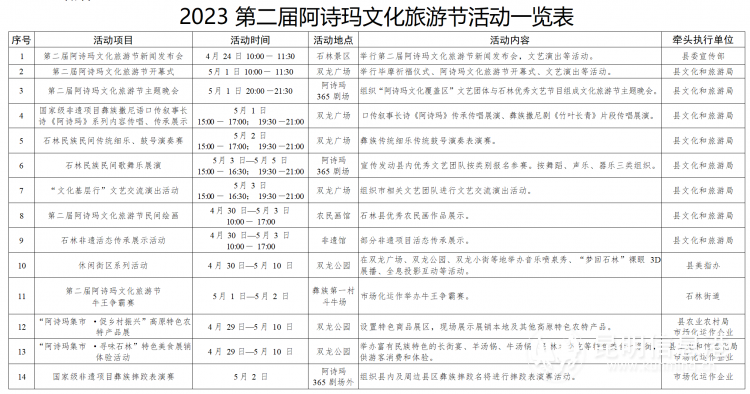 石林县文化和旅游局负责人介绍,政府主办的活动主要有2023年第二届中国石林阿诗玛文化旅游节开幕式及主题晚会、国家级非遗项目彝族撒尼语口传叙事长诗《阿诗玛》系列传承传唱展示展演、石林民族民间传统细乐、鼓号演奏表演赛、石林民族民间歌舞展演活动、“文化基层行”文艺交流演出活动、石林民间绘画展、石林非遗馆非遗活态传承展示活动、石林国家级旅游休闲街区系列活动(音乐喷泉秀、“梦回石林”裸眼3D展播、全息互动投影)、石林风景区“牵手阿诗玛”五天乐活动、长湖风景区“五一露营音乐节”活动、长湖龙文化旅游节活动、石林街道月湖乡村歌手演唱会等。