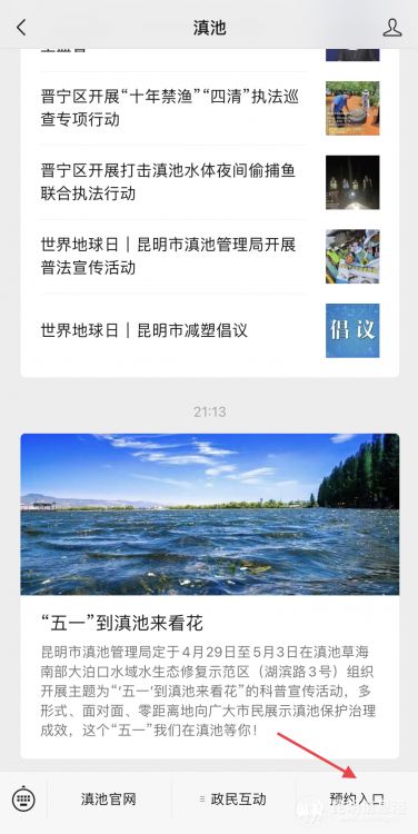 微信关注“滇池”公众号,点击“滇池”公众号菜单栏“预约入口”进入报名页