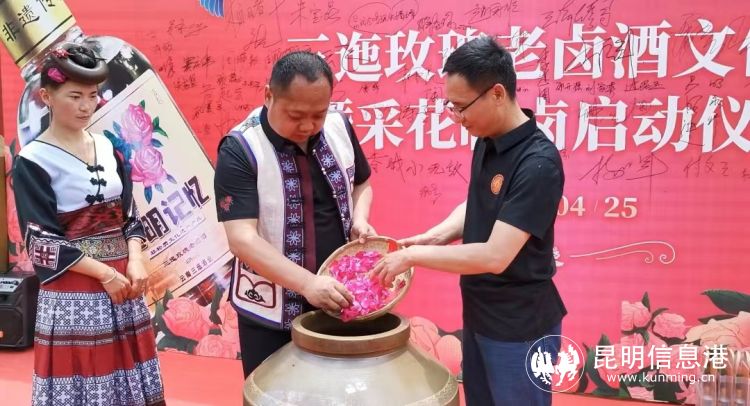 在启动仪式上,玫瑰老卤酒非遗传承人陶俊勇和爱徒黄德明共同将采摘下来的鲜花放入酒缸,在缸内进行首缸打耙,打耙完毕立即封缸,从封缸的这一刻开始标志着2023年三迤酒业采花制卤正式启动。接下来,鲜花将从田间来到车间,入缸制卤,经98道工序,8个月时间沉淀开启漫长蜕变之旅。