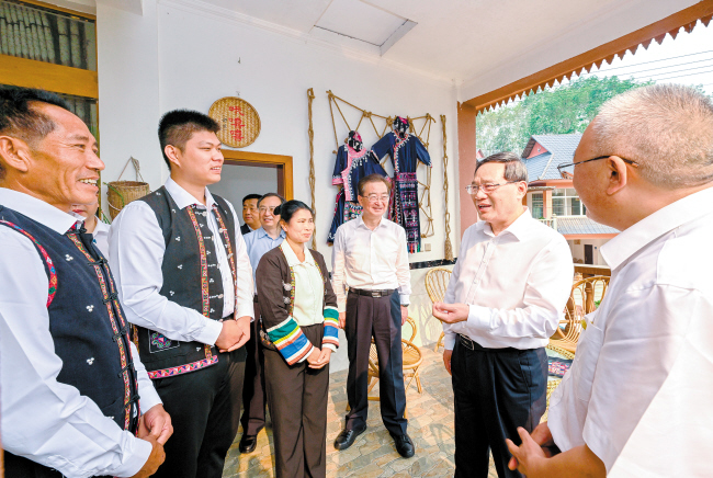 4月26日,李强在云南西双版纳勐腊县勐腊镇补蚌村与脱贫户、村干部和村民代表深入交流。新华社