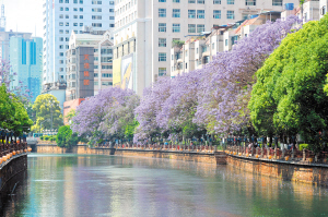 盘龙江畔盛开的蓝花楹。 记者黄晓松摄