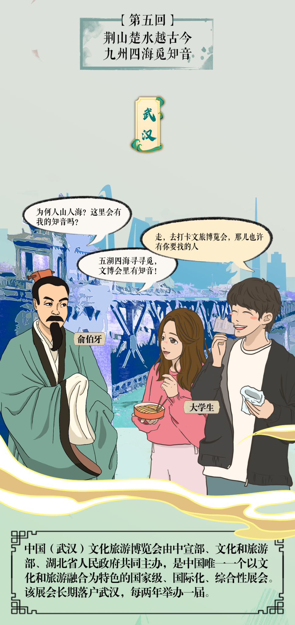 荆山楚水孕古育今,璀璨文化历久弥新。伯牙穿越百万年荆楚历史所寻觅的知音,正是这届中国(武汉)文化旅游博览会所要传达的思想—— 以开放姿态迎八方客,在九州四海寻觅读懂一座城的“知音”。